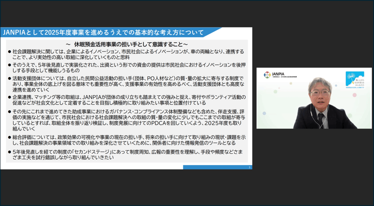 休眠預金活用事業の資金分配団体向けに、2025年度JANPIA事業計画のポイント、スケジュールについて共有する会をオンラインで開催しました。