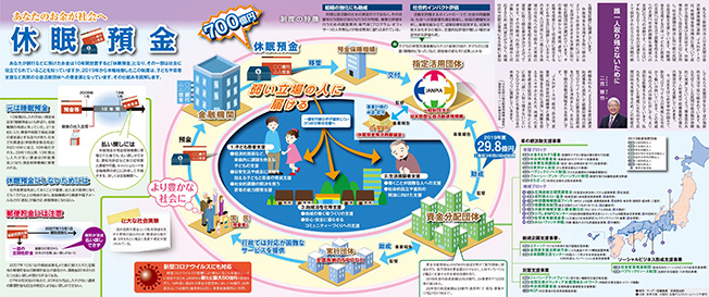 別刷りサンデー版「大図解シリーズ」にて、見開き2ページで「休眠預金」が取り上げられ、記事中で2019年度資金分配団体の皆さまの団体名・事業名も掲載予定となっています。