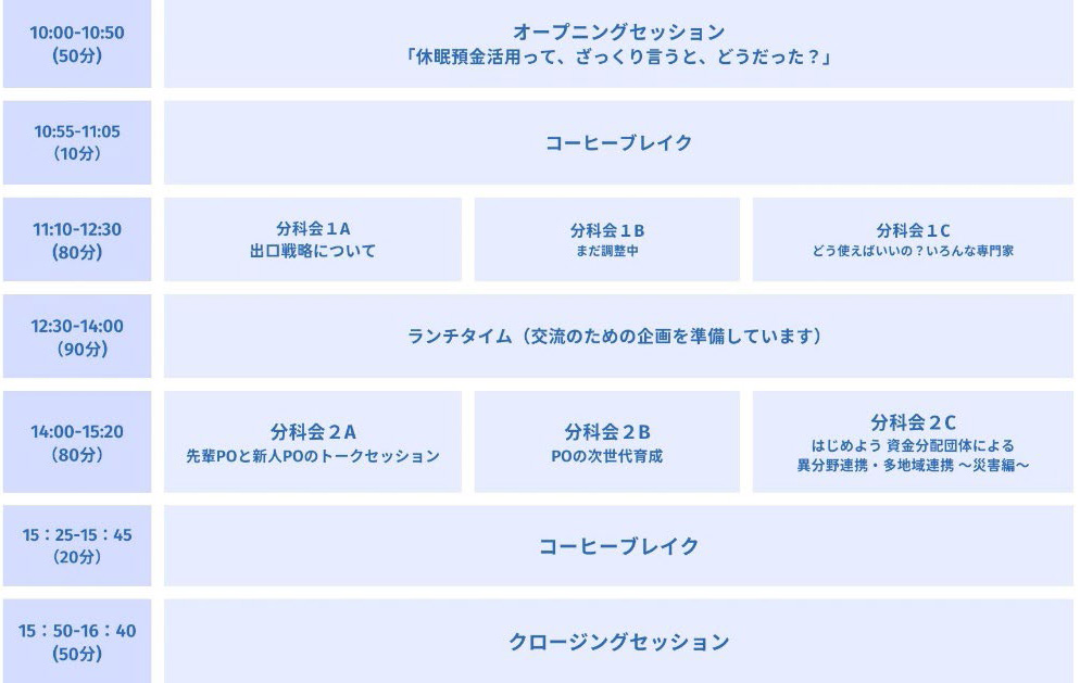 休眠預金活用事業が始まり5年が経った今、休眠預金活用事業のPOの皆さまが一同に集い、横の連携や知の共有を行う場として、「休眠預金事業POギャザリング※」を企画・開催いたします。※ギャザリングとは、複数のテーマごとに部屋を分かれて対話するカンファレンスと、交流企画が一緒に開催される場となります。